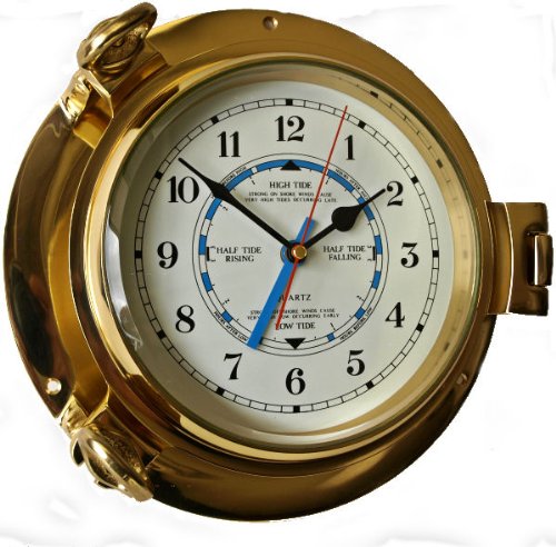 A quality 9 inch diameter solid brass nautical porthole time and tide clock . Highly polished stable brass and lacquer lined. It features a bezel top of 2" with a thick beveled crystal. It's weight is roughly 6 lbs. The tide motion works off a 12 hour and 25 minute rotation for each 360 (degrees). The motion has a 3 12 months manufacturer's guarantee. We also offer a 30-day money-back assure if you're no longer totally satisfied with the clock. Operates off one 'AA' battery. Easy to set and maintain. Instructions for surroundings the tide will accompany the clock. We elevate rosewood clock plaques and brass engraving identify plates to customize it. Free clock mounting and design work.. ... Read more Large 9" Brass Porthole Time and Tide Ship's Clock - Heavy 6 Pounds of Solid Brass with working Thumb Screws